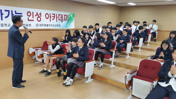 제민일보사(대표이사 사장 김영진)와 제주특별자치도교육청이 공동 주최하는 '2018 찾아가는 인성아카데미'가 6일 세화중학교(교장 송시태) 강당에서 1학년 학생들을 대상으로 열렸다. 이날 아카데미에서 강사로 나선 송삼석 국가인권위원회 인권강사는 인권이란 인간이 인간답게 살아가기 위해 누구나 마땅히 누려야 할 권리라는 점을 강조했다.