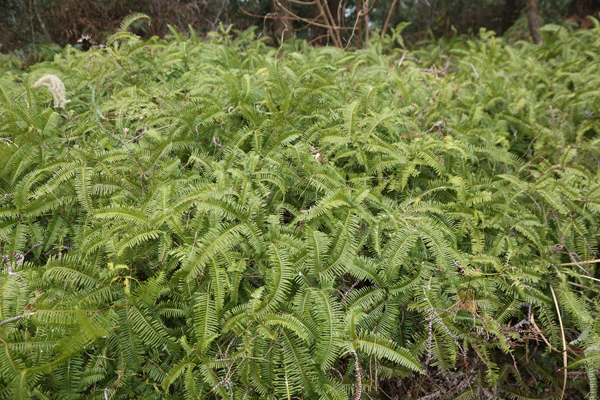 곶자왈을 탐방하다보면 아주 크게 자라는 양치식물을 만나게 된다. 줄기는 가늘지만 높이가 1.5m는 넘긴다. 대부분의 식물도감에서 이 정도라고 한다. 그러나 이 식물의 신장 생장 특징은 좀 남다른 데가 있다. 스스로 곧추 설 수 있는 능력도 없으면서 그렇다고 다른 물체, 예컨대 나무나 바위 위를 기거나 감아 올라가는 것도 아니다. 그냥 슬그머니 기대어 자란다. 그러니 담쟁이처럼 흡착근도 없고 호박이나 하늘타리처럼 덩굴손이 있는 것도 아니다. 칡처럼 다른 물체를 칭칭 감는 건 더욱 아니다.