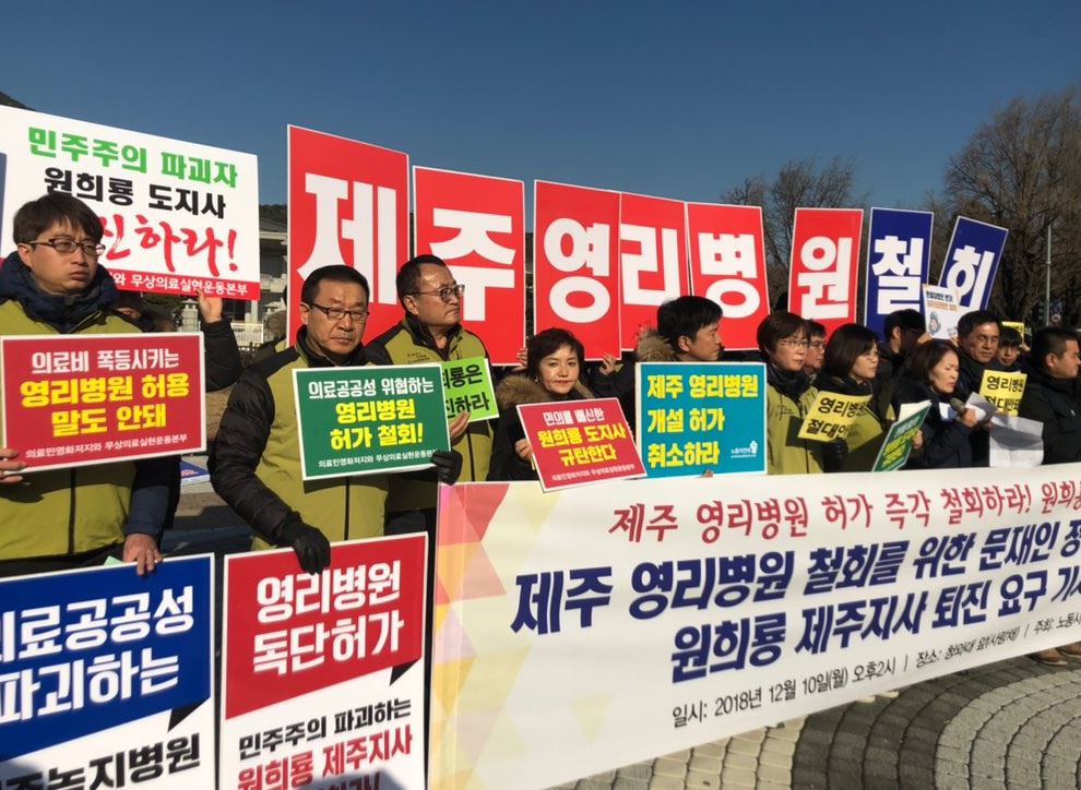 영리병원 철회와 의료민영화 중단을 요구하는 노동 시민 사회단체는 10일 청와대 앞에서 기자회견을 열고 "문재인 대통령은 제주 영리병원 허가에 대한 입장을 밝히고,'영리병원 설립 금지' 공약사항을 이행하라"고 요구했다.