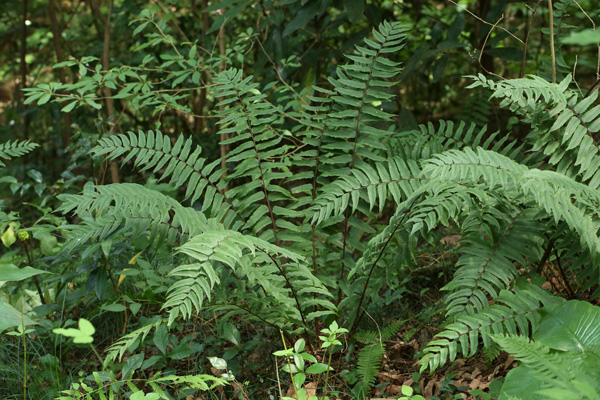 키는 50㎝ 내외, 10~14쌍의 작은 잎 조각들이 깃 모양의 잎을 만든다. 이 잎 조각들은 창날모양이거나 끝이 뾰족한 달걀모양을 하고 있다. 가장자리는 밋밋하거나 구불구불하다. 표면은 반짝이고, 뒷면에 포자낭군이 특별한 규칙이 없이 흩어져 붙어 있다. 포자낭군을 덮는 포막은 방패모양인데 가운데가 검은색이다.
