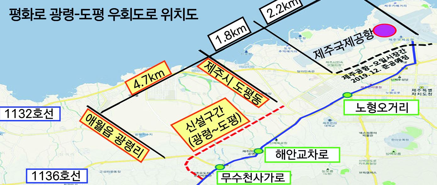 평화로(광령~도평) 도시우회도로가 국비 지원사업으로 선정돼 추진되면 광령~월광로~오일장~제주공항과 연계돼 제주공항 유·출입 교통량을 우회처리 할 수 있게 돼 제주공항 이용객 통행시간 단축과 제주시 서부권 도시교통 체증이 해소될 것으로 전망하고 있다.