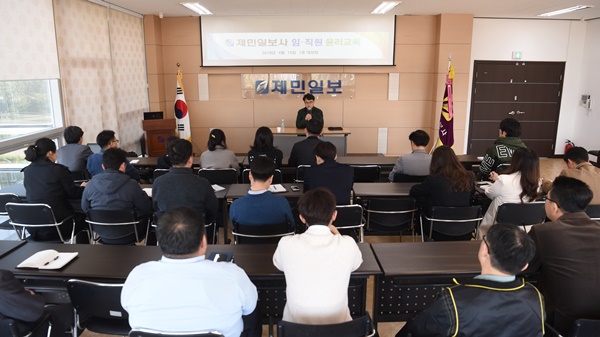 김영채 제주애기업협의회 회장은 15일 제민일보사 1층 대강당에서 임·직원을 대상으로 제주도 기업하기 좋은가 등과 관련한 내용을 가지고 윤리교육을 진행했다.