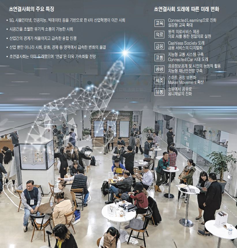 전통적인 지리 공간과 발전은 이제 통하지 않게 됐다. 산업기술만으로는 설명하기 힘들다. '탈집중화'라는 큰 틀 아래 과거 통신 환경은 인터넷으로 교체됐고, 관치 경제 개념을 시장경제가 대체했다. 지역 주도, 지방분권 논의도 시작한 지 오래다. 인터넷에 보안과 신뢰를 강화한 블록체인 시장이 부상했고, 공유경제와 주민자치·거버넌스 등 자기조직화 움직임도 활발해지고 있다. 이런 측면에서 초연결시대는 세포분열처럼 연결할 수 있는 고리가 늘어나는 것으로 설명할 수 있다. 그 핵심은 사람이다.