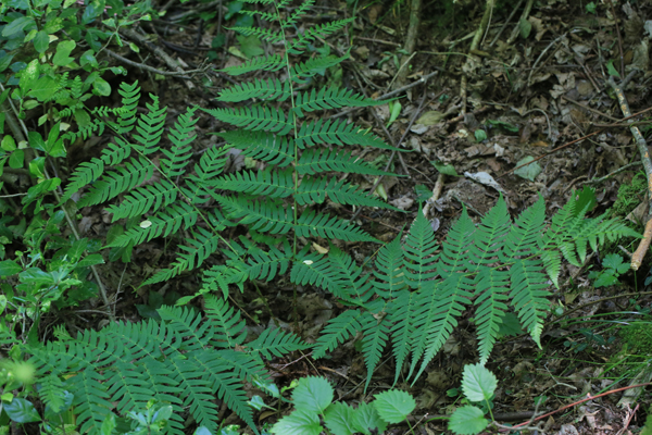 뿌리줄기는 곧게 서거나 비스듬한데 굵고 짧기 때문에 뭉툭한 느낌을 준다. 잎은 보통 길이 50~60㎝다. 잎자루에는 흑갈색 또는 진한 갈색의 비늘조각이 많이 붙어 있다. 잎몸은 좀 마른듯하면서도 겉은 다소 거친 느낌을 준다. 흔히 종이질이라고 표현한다. 양면에 털은 없고 검은 비늘조각이 붙어 있다.