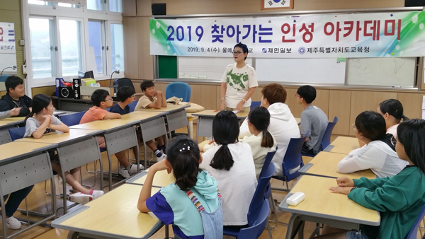 제민일보사(대표이사 사장 김영진)와 제주특별자치도교육청이 공동으로 진행하는 '2019 찾아가는 인성아카데미'가 4일 물메초등학교(교장 강병희) 5~6학년 학생들을 대상으로 진행됐다. 이날 강사로 나선 이길주 제주대학교 철학과 교수는 초등학생의 티를 벗어가기 시작하는 초등학교 고학년 학생들에게 더불어 살아가기 위한 바른 인성과 그것을 실천해나가기 위한 행동들에 대해 소개하는 시간을 가졌다.