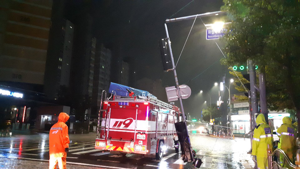 21일 오후 11시23분께 제주시 화북동 삼화단지 LH아파트 입구 사거리 신호등이 파손됐고, 22일 오전 4시2분께 제주시 용담이동의 한 주차장과 다호마을·애월읍 하귀2리 주택이 침수돼 배수작업이 이뤄졌다.
