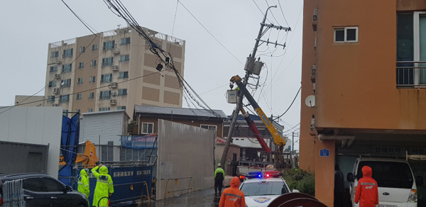 지난 21일 오후 11시23분께 제주시 화북동 삼화LH아파트 입구 사거리 신호등이 강한 바람에 파손됐고, 22일 오전 8시쯤에는 건입동과 조천읍 등에서 전신주가 크게 기울어 소방당국이 안전조치에 나섰다.