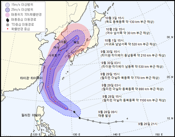 고수온 해역서 발달...10월 1일 서귀포 남남서쪽 520㎞ 부근 해상까지 진출