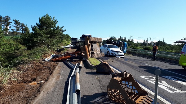 경찰은 트럭이 제주시에서 서귀포 중문방향으로 이동하던 중 2차선 연석을 들이받아 사고가 난 것으로 보고 있다.