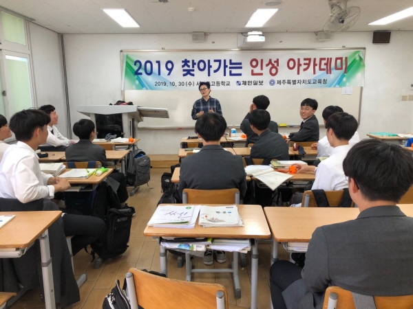 제민일보사(대표이사 사장 김영진)와 제주특별자치도교육청이 공동으로 진행하는 ‘2019 찾아가는 인성아카데미’가 30일 서귀포고등학교(교장 정성중) 1학년 1반 교실에서 학생 15명을 대상으로 진행됐다. 이날 강사로 나선 이길주 제주대 철학과 교수는 학생들과 자유롭게 질문과 대답을 주고받는 ‘철학하기’를 통해 배려의 진정한 의미를 이해하는 시간을 가졌다.