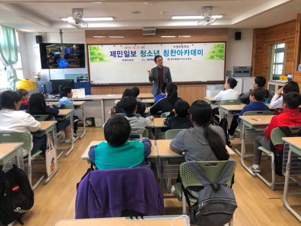 제민일보사(대표이사 사장 김영진)와 제주특별자치도가 공동 주최하는 ‘2019 찾아가는 청소년 칭찬아카데미’가 31일 수원초등학교(교장 김상수) 5학년 1반 교실에서 학생 26명을 대상으로 실시됐다. 이날 칭찬아카데미 강사로 나선 송삼석 국가인권위원회 인권강사는 칭찬의 효과와 방법을 사례를 들어 설명하며 일상 생활속에서 칭찬을 실천하는 행동의 중요성을 강조했다.