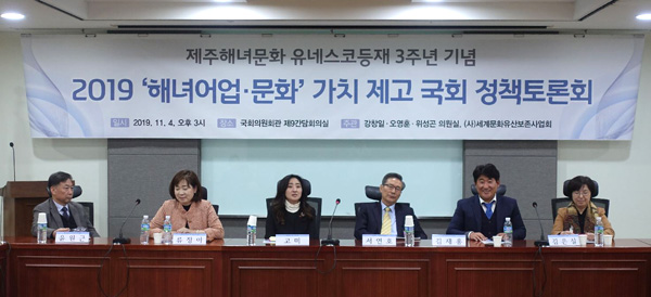 '제주해녀'가 지닌 가치를 어디에서 어떻게 찾아야 할 것인가. 과연 우리는 제대로 찾으려 하고 있는가. 지난 4일 국회의원회관에서 열린 제주해녀문화 유네스코 인류무형문화유산 대표목록 등재 3주년 기념 국회 정책토론회가 예정 시간을 넘기며 뜨겁게 이어졌던 배경에 던져진 질문이다. 문화다양성의 상징이라고 하면서도 정작 대상화하는데 급급하며 마치 기울어진 운동장에 서 있는 상황이 됐다는 점에 공감했다.