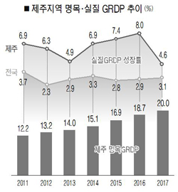 2011~2017 제주지역 GRDP는 연평균 6.4% 성장했다. 같은 기간 전국 평균 실질 성장률은 3.1%였다. 제주 GRDP는 2016년만 6.9% 상승했을 만큼 전국 대비 높은 성장률을 보였다. 2013년 4.9%를 제외하고 6%대 성장률을 유지했다. 2014년 6.9%·2015년 7.4% 등 2016년까지 3년 동안 가파른 상승세를 이어가던 분위기는 2017년 4.6%로 주춤한데 이어 지난해 -1.7%로 전국평균(2.8%) 이하로 떨어졌다. 전국 대비 호조세를 보였던 사정이 불과 2년 사이 10년 전으로 후퇴한 데 따른 충격은 '조정 상황'이란 설명만으로는 부족하다.