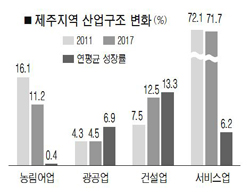 하지만 2016년을 정점으로 순유입 인구가 줄어들고 사드(THAAD·고고도미사일방어체계) 보복이 현실화하면서 사정은 급변했다. 실수요 증가와 주택가격 상승 기대에 부응했던 투자 수요가 줄어들고 부동산 경기마저 흔들렸다. 2017년 16.3%나 성장하며 제주 경기를 이끌었던 건설업은 지난해만 19.2% 하락했다. 하늘 높은 줄 모르고 늘어나던 가계대출 역시 상환 부담 등 경기를 흔들 시한폭탄이 됐다. 전국 수준을 크게 상회하는 고용률도 농림어업 등 1차산업 외에는 숙박·음식점업 등 저부가가치 산업을 중심으로 하면서 안정성을 잃었다.