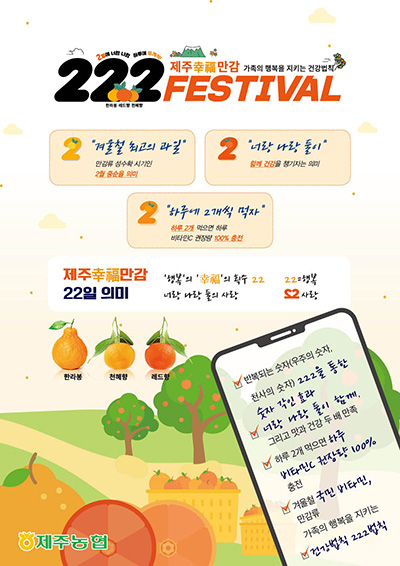 '222'는 제주산 만감류가 맛이 들기 시작하는 2월의 '2'와 너랑 나랑 함께를 의미하는 '2', 하루에 2개씩 즐긴다는 '2'를 상징하는 표현으로 '2월에 너랑 나랑 둘이 하루에 2개씩 먹자'는 의미를 담고 있다.
