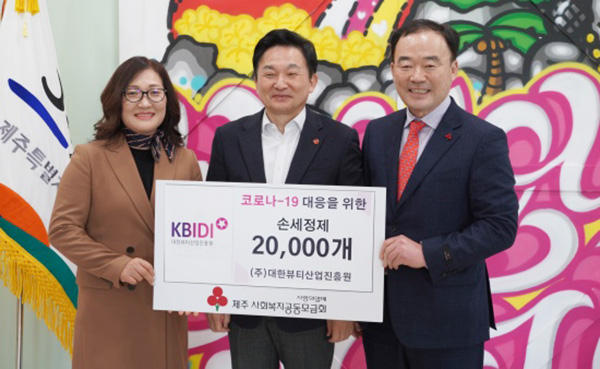 제주스타상품 기업인 ㈜대한뷰티산업진흥원(대표 강유안)이 코로나19 극복에 힘을 보탰다.