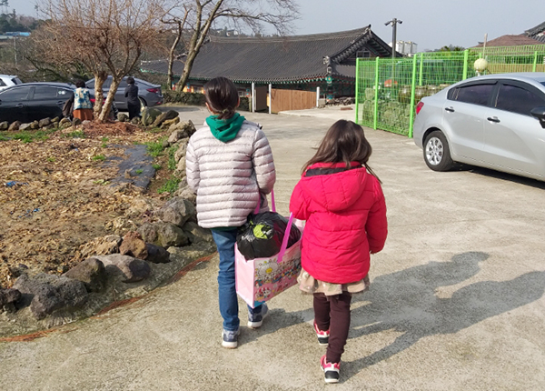 코로나19로 개학이 연기되면서 집에 있던 초등학생 자녀 2명은 A씨를 따라 책가방 대신 식사배달봉사 장바구니를 들고 "할머니, 식사하세요"라며 아라동에 거주하는 어르신에게 식재료를 전달했다.