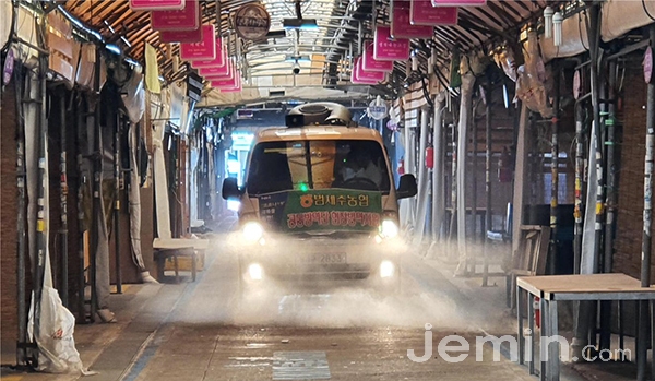 제주시 민속오일시장이 열리기 전날인 지난 1일 코로나19 예방을 위한 방역차량이 오일장 곳곳을 돌며 방역에 구슬땀을 흘리고 있었다