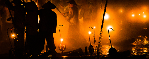 공연은 수상 무대 위 스크린을 통해 영화 '유삼저' 중 노래하는 장면을 방영하는 것으로 시작한다. 화면에서 '산가는 마치 봄날 강물 같네(山歌好比春江水)'가 울려 퍼지고 조명은 멀리서 천천히 다가오는 작은 배 한 척을 비춘다. 배에는 아련한 추억 속의 유삼저가 있다.