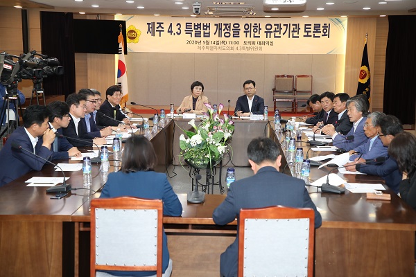 제주도의회 4·3특별위원회(위원장 정민구)는 14일 도의회 대회의실에서 도의회 4·3특위, 제주도, 도교육청, 4·3평화재단, 4·3유족회, 4·3기념사업회 등이 참석한 가운데 '제주4·3특별법 개정을 위한 유관기관 토론회'를 개최했다.
