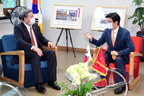 왕루신 총영사는 24일 제주특별자치도교육청을 방문해 이석문 교육감에게 보건용 마스크 1만4000매, 아동용 KF 마스크 1만4000매, 손소독제 2000개를 전달했다.