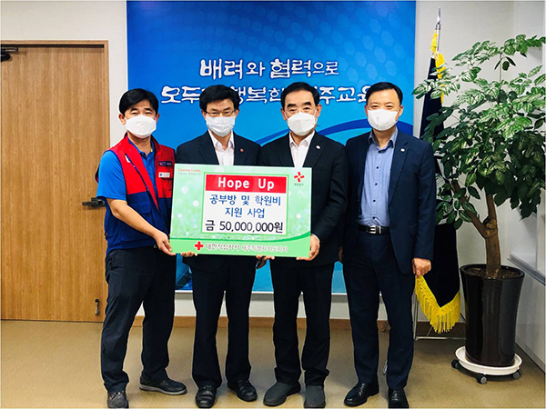 대한적십자사제주특별자치도지사(회장 오홍식)는 25일 제주도교육청 교육감실에서 코로나19로 경제적 어려움에 놓인 학생을 위한 'Hope Up 공부방 및 학원비 지원' 사업비 5000만원을 도교육청에 전달했다.