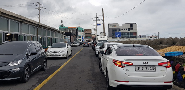지난 5일 오후 12시30분께 세화오일시장은 주말 장보기에 나선 시민들로 붐빈 가운데 같은 시각 시장 주변 도로변에서는 주차 전쟁이 벌어지고 있는데 주말이란 그런지 주차요원은 보이지 않았다.