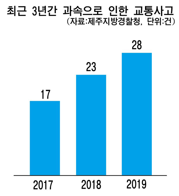 15일 제주지방경찰청에 따르면 최근 3년간 과속으로 인한 교통사고는 2017년 17건(사망 5명·부상 34명), 2018년 23건(사망 8명·부상 34명), 지난해 28건(사망 3명·부상 55명)이 발생하면서 매년 증가하고 있다.