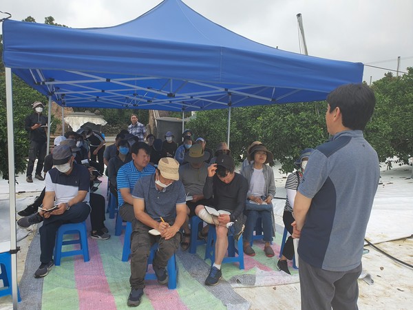 감귤열매는 세포로 이뤄져 있기 때문에 세포가 튼튼해야 열매가 단단하다. 그래서 칼슘이 세포막을 구성하고 있기 때문에 칼슘을 적절하게 공급해야 세포가 튼튼해 진다. 그리고 광합성으로 만든 양분을 칼륨(가리)이 옮겨다가 세포에 가득 저장해야 세포가 단단해 진다. 가리가 옮겨 갈 양분을 많이 만들기 위해서는 엽록소가 튼실해야 한다. 엽록소 구성 요소는 마그네슘이기 때문에 마그네슘도 알맞게 공급해 줘야 하는 등등,, 복합적인 요인들이 합쳐져서 당도 높고 튼튼한 고품질 감귤이 만들어지는 것이다. 강사=김진성 농가. 정리=윤주형 기자