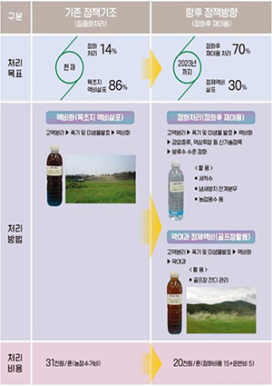 방류수 수준의 정화처리 목표를 현재 14%에서 2023년까지 70%로 끌어올린다. 나머지 30%는 막여과 장치의 정제과정을 통해 현재 액비살포 기준보다 더욱 엄격한 기준 액비로 처리해 도내 골프장 잔디 관리용수로 활용한다.