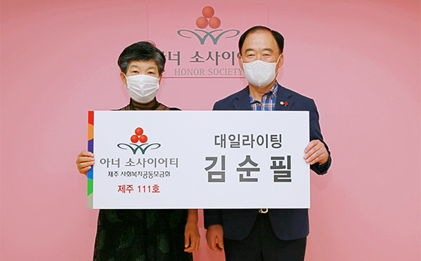 김순필 대일라이팅 이사는 지난 17일 제주사회복지공동모금회(회장 김남식)가 진행하는 1억원 이상 고액기부자 클럽인 '아너 소사이어티'에 가입했다. 김 이사는 도내에서 아너 소사이어티 111번째 회원으로 등록했으며, 전국에서는 2388번째 회원이 됐다. 김 이사는 "나눔은 실천하는 사람도, 도움을 받는 사람도 모두가 행복해지는 길이라 생각한다"고 말했다.