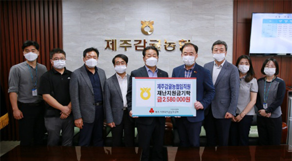 제주감귤농협(조합장 송창구)은 최근 제주감귤농협 본점에서 어려운 이웃을 돕는데 써달라며 성금 258만원을 제주사회복지공동모금회(회장 김남식)에 기탁했다. 이 성금은 제주감귤농협 임직원들이 제주형 2차 재난긴급생활지원금을 자발적으로 모아 마련한 것이다. 제주감귤농협 임직원들은 지난 1월에도 성금 873만원을 기탁했다.