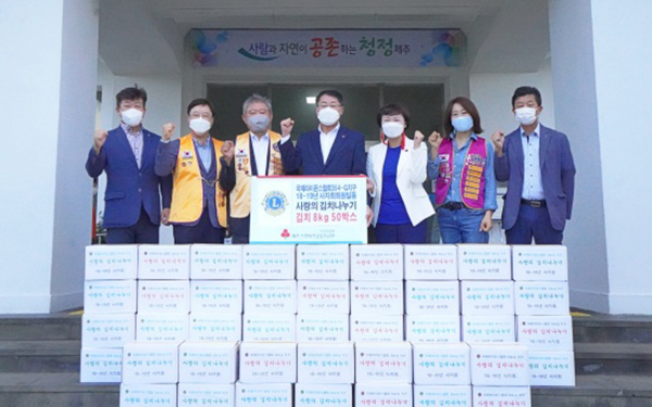 국제라이온스협회 354-G지구 18-19년 사자회(회장 조재홍)는 최근 제주시청에서 태풍 등으로 채소 가격이 폭등해 김치 장만이 어려운 이웃에 전해 달라며 김치 400㎏을 제주사회복지공동모금회(회장 김남식)에 기탁했다. 회원들이 직접 담근 김치는 제주시홀로사는노인지원센터에 전달됐다.