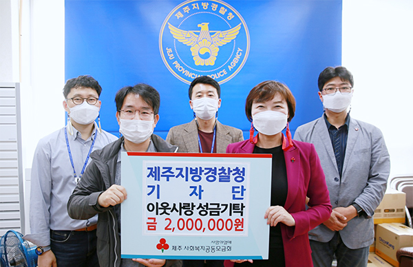제주지방경찰청 기자단(간사 김정호)는 13일 제주지방경찰청 기자실에서 제주사회복지공동모금회(회장 김남식)에 코로나19 성금 200만원을 기탁했다. 제주지방경찰청 기자단은 제주지방경찰청에 출입하는 중앙언론 제주주재기자와 제주지역 언론 기자 등 30개 언론사 소속 기자들로 구성된 단체로 코로나19로 인해 어려움을 겪는 아동을 위해 성금을 마련했다.