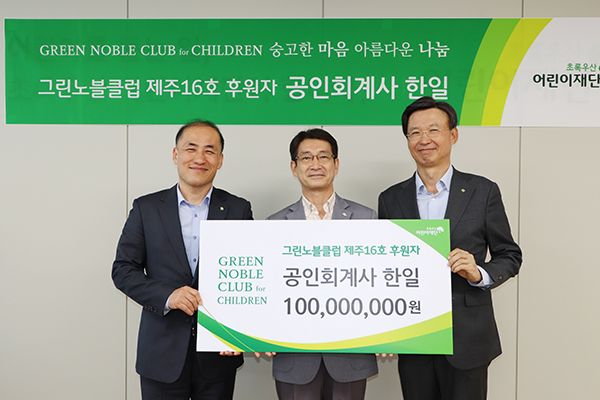 제주시 오라동에 위치한 한일세무회계사무소 한일 회계사는 최근 초록우산 어린이재단 제주지역본부(본부장 김희석)가 어린이의 꿈과 미래를 위해 진행하는 1억원 이상 고액기부자모임인 그린노블클럽 제주16호 회원에 가입했다. 한일 회계사는 앞으로 후원금 1억원을 5년 동안 나눠 기부할 예정이다.