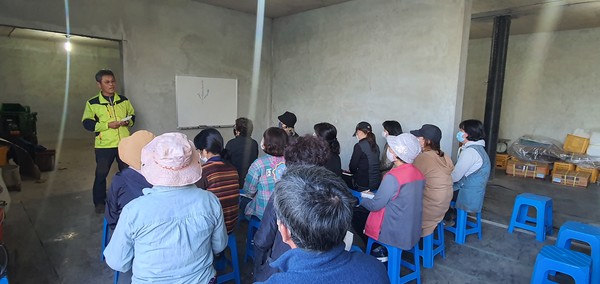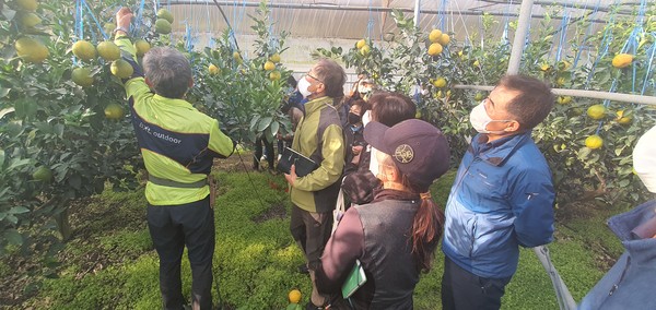 열매 매달기는 아무리 강조해도 지나치지 않는다. 예를 들어 한라봉 열매 8개 가량으로 3㎏을 만들어야 하는데, 3㎏를 만들기 위해 한라봉 열매 10개, 11개가 되게 해서는 고수익을 올리기 쉽지 않다. 열매 크기를 키우고 고품질 한라봉을 생산하기 위해서는 열매 매달기를 제대로 해야 한다. 그래야 열매 8개 가량으로 3㎏의 상품 한라봉을 생산할 수 있는 것이다. 열매를 매달 때는 끈을 수직으로 해서 나뭇가지가 하늘로 향하게 해야 한다. 끈을 45도 방향으로 비스듬하게 해서 매달면 가지도 비스듬하게 된다. 열매 매달기는 나뭇가지가 꺾이는 것을 방지하는 목적보다는 나무의 영양분을 열매로 가게 해서 고품질 한라봉을 생산하기 위한 방법 가운데 하나다. 강사=강성훈 농가. 정리=윤주형 기자