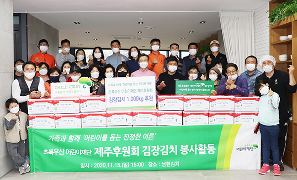 초록우산 어린이재단 제주후원회(후원회장 강문원)는 15일 제주시 남현김치에서 운영위원과 가족 30여명이 참여한 가운데 김장김치 봉사활동을 갖고, 직접 담근 김장김치 300포기(1000㎏)를 초록우산 어린이재단 제주지역본부(본부장 김희석)에 전달했다. 후원 물품은 도내 소외가정과 아동복지시설에 전달할 예정이다. 어린이재단 제주후원회는 회원 본인의 기부 외에 봉사활동과 나눔문화 확산에 앞장서고 있다.