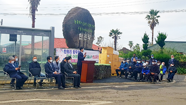 제주도한원리향우회 회원들은 "태어나고 성장한 한원리에 대한 사랑과 감사하는 마음을 가슴 속에 간직하며 살아가고 있다"며 "한원리민 모두가 사람들을 힘들게하는 코로나바이러스를 멀리하고 행복바이러스로 충만한 삶을 살아가길 기원한다"고 전했다.