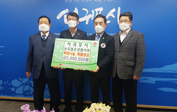 서귀포시농축협운영협의회(의장 김성범 중문농협 조합장)는 29일 서귀포시청을 방문해 연말연시를 맞아 지역사회 어려운 이웃들을 위해 써달라며 희망나눔 특별성금 500만원을 대한적십자사제주특별자치도지사(회장 오홍식)에게 전달했다.
