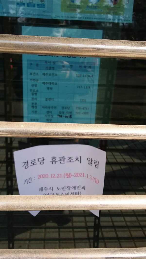이제 오늘에 와서 노인들께 일어나는 가장 큰 문제는 지난해 2월 코로나19 라는 악성 바이러스가 국내 유입됨으로써 면역력이 약한 어르신들이나 기저 질환을 가진 노인들에게는 치명적 가해를 입힐수 있고 중대본 방역지침에서 KF94 마스크 착용은 필수이며 사회적 거리두기 2단계에서 2.5단계까지 발효로 마을 경로당에도 연이은 휴관 조치가 내려지고 노인들만의 행복한 공간은 코로나에 의해 탈취당했다. 뿐만 아니라 노인들을 위한 요양시설이나 병원에서도 집단 확진자가 발생하는 사태에 사망자까지 발생하게 되는 말할 수 없는 공포에서 노인들은 헤어날 수 없었다.