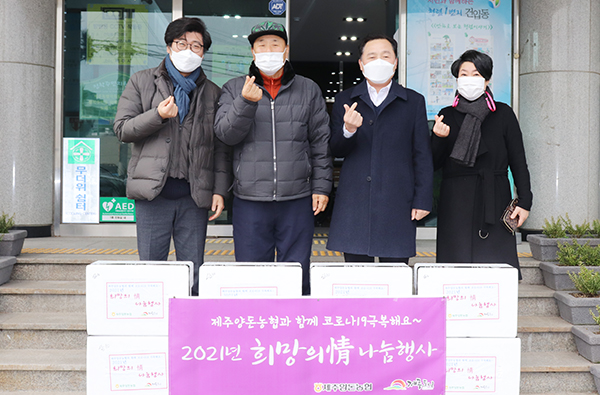 제주양돈농협(조합장 고권진)은 코로나19로 인해 사회적 거리 두기, 집합금지 등 경기침체로 인한 소비심리 위축으로 신축년 새해 '희망의 정' 두번째 나눔행사를 18일 개최했다.