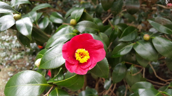 꽃은 기쁨을 축하해 주기도 하고 슬픔을 위로해 주기도 한다. 동백꽃의 대표적인 꽃말은 '기다림'이다. 제주4·3사건의 희생자를 기리는 의미만이 이 꽃의 전부가 아니다. 한 그루 꼿꼿이 서있는 이 동백은 코로나19로 인한 사회적 거리두기 등으로 꼼짝 못하는 요즘, 우리에게 차분히 기다리라는 위로의 말을 하고 있는 것은 아닐까.