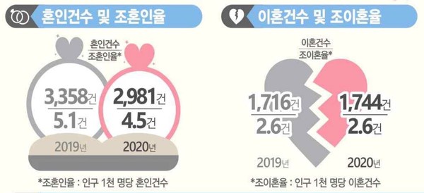 인구1000명당 혼인건수인 조혼인율도 2019년 5.1건에서 지난해 4.5건으로 감소했다.
