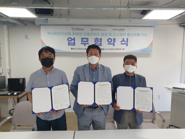 역사문화자원을 활용한 원도심 활성화에 공공기관·민간단체·대학교, 세 개 기관이 머리를 맞댔다. 제주도시재생지원센터(센터장 유희동), 제주대학교 경영대학원 문화예술경영학과(주임교수 김정훈), 사단법인 질토래비(이사장 문영택)는 지난 7일 도시재생 상생모루에서 업무협약을 체결하고, 제주시 원도심 도시재생사업의 일환으로 추진하고 있는 다양한 사업들과 원도심 활성화를 위해 공공기관과 대학, 민간주체의 힘을 모아 다양한 인적자원과 의견을 공유하게 된다.