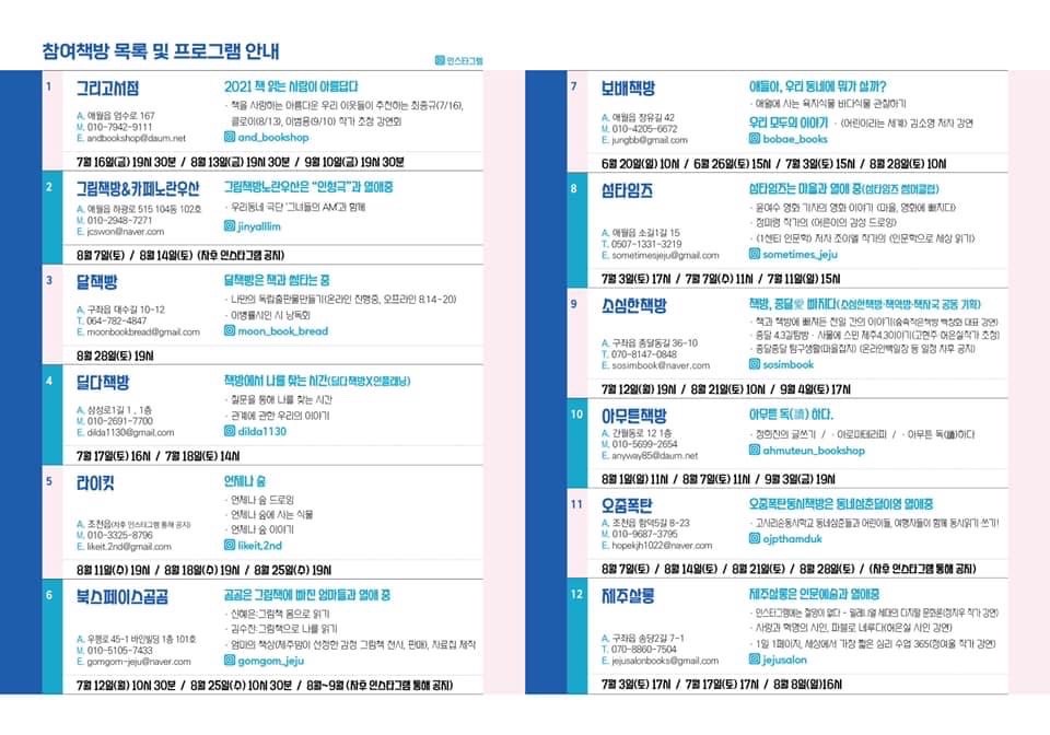 올해 참여 책방은 △그리고서점(애월읍) △그림책방&카페노란우산(애월읍) △달책빵(구좌읍) △딜다책방(이도일동) △라이킷(조천읍) △소심한책방(구좌읍) △보배책방(애월읍) △북스페이스곰곰(도평동) △섬타임즈(애월읍) △아무튼책방(아라이동) △오줌폭탄(조천읍) △제주살롱(구좌읍) △책방소리소문(한림읍) △책약방(구좌읍) △책자국(구좌읍) △카페동경앤책방(애월읍) △한뼘책방(이도이동) △헌책방동림당(삼도이동) 등 18곳이다.