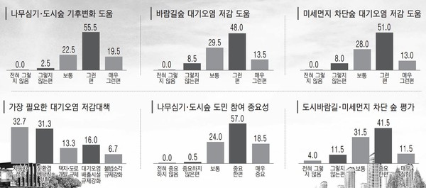 나무심기 외에 가장 필요한 대기오염 저감대책으로는 '택지 및 도로 개발 규제' 28.0%, '친환경에너지 전환' 22.5%, '자동차 감축' 20.0%, '대기오염배출시설 규제 강화' 19.0%, '불법소각 규제 강화' 10.5% 순으로 꼽았다.