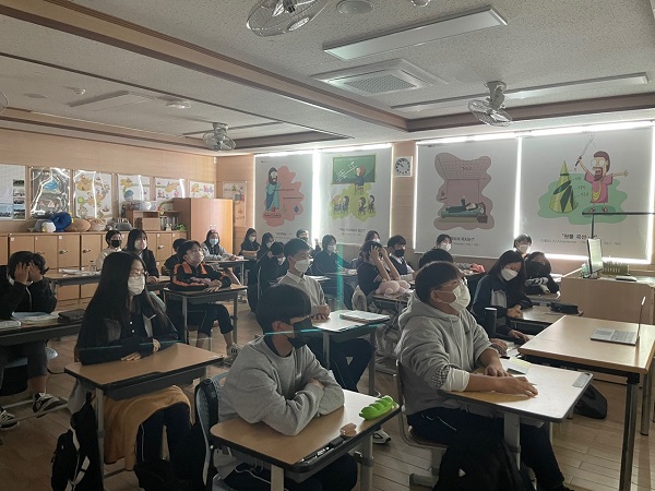 제민일보사(대표이사 사장 양치석)와 제주도가 공동으로 주최하는 '2021 찾아가는 청소년 칭찬아카데미'가 지난달 21일 남원중학교 1학년 1반 학생을 대상으로 진행됐다. 이날 강사로 나선 김인희 아시아투데이 기자는 '항일 독립군의 역사'를 주제로 학생들에게 미래 경쟁력 확보 등을 위한 대안을 제시했다. 특히 강의는 유튜브 중계와 실시간 화상회의(ZOOM)를 활용한 비대면 방식으로 이뤄지면서 학생들과 일일이 소통하는 시간을 가졌다. 제민일보 역시 '위드코로나' 시대에 맞는 소통 창구로서 역할을 이어가고 있다.