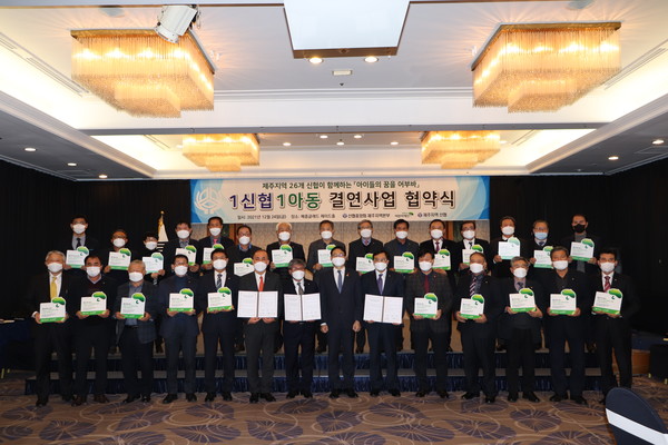 신협중앙회 제주지역본부(본부장 허영진)와 도내 26개 신협은 24일 메종글래드 제주에서 초록우산 어린이재단 제주지역본부(본부장 김희석)와 함께 지역 내 아동을 결연해 후원하는 '1신협1아동 결연사업' 협약식을 가졌다. 이번 협약에서 신협은 월 565만원(연 6780만원)의 후원금을 아동에게 지원하기로 했으며, 모두 41명의 아동이 지원을 받을 예정이다.