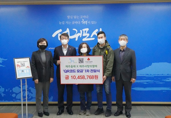 제주사회복지공동모금회(회장 강지언)는 지난 24일 서귀포시청에서 ㈔제주올레(이사장 서명숙)에 QR코드 모금을 통해 마련한 성금 1045만8768원을 1차로 전달했다.