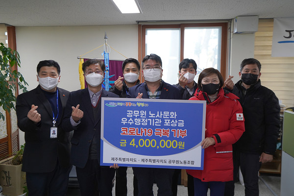 제주특별자치도와 제주도공무원노동조합(위원장 오태권)은 7일 '2021년 공무원 노사문화 우수행정기관 인증제'를 통해 받은 국무총리 기관표창 포상금 400만원을 전액 기탁했다.